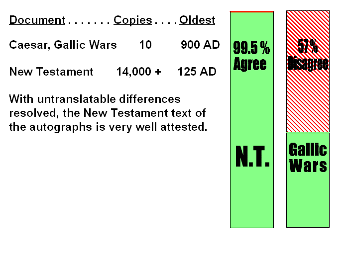 As noted, in the chart above, there are only ten extant copies of Julius Caesar's "Gallic Wars." We would think that the writings of a world ruler and a military conqueror of distant lands would have been afforded great attention by the world's scholars. Yet, very few copies remain. The text of those extant copies disagree by 57% between one another. In contrast, the New Testament is the account of the life and ministry of a peasant, who was born in obscurity and who died as a criminal. His birthplace and place of death were separated by only ten miles. We would expect His story to be lost and forgotten.