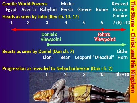 | Relative time | o- - - -> Daniel's viewpoint (Dan 2:28) | <- - -o- -> John's viewpoint (Rev 13:1) |